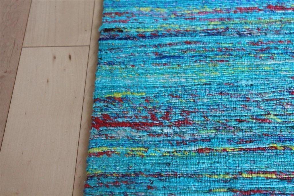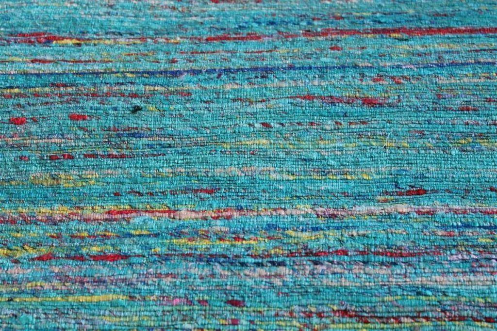 Add wonder and beauty to a space with this turquoise blue sari silk rug. This fascinating blue rug is speckled with other bold colors that help brighten up the room and widen your options for accessorizing.