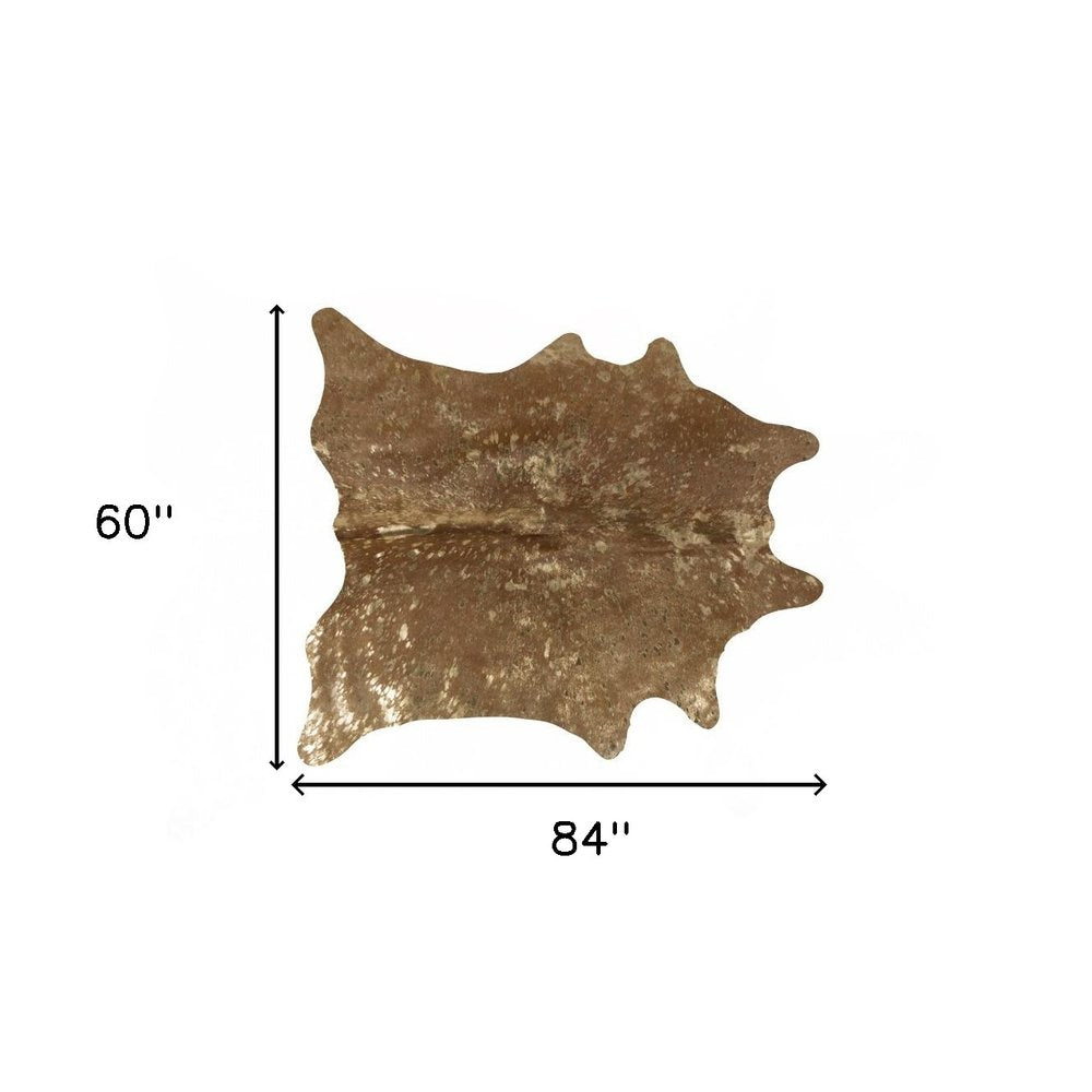 Elevate your living space with our stunning 5' x 7' Gold and Brown Cowhide Hand Knotted Area Rug. Each piece is meticulously crafted by skilled artisans, making every rug a one-of-a-kind statement. The rich gold and brown hues, paired with the authentic cowhide texture, effortlessly blend elegance with rustic charm. Stain-resistant and durable, this rug is perfect for busy homes with kids and pets. Make any room feel more inviting while enjoying a genuine work of art beneath your feet.