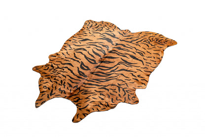 Bring home a striking centerpiece with the 6' x 7' Brown and Black Cowhide Tiger Print Area Rug. Crafted from premium cowhide, this luxurious area rug blends eye-catching tiger print patterns with soft, durable texture. Its generous size makes it ideal for living rooms, bedrooms, or offices, providing warmth, noise reduction, and a unique style statement. Showcase your taste and transform your space with this modern, animal print rug.
